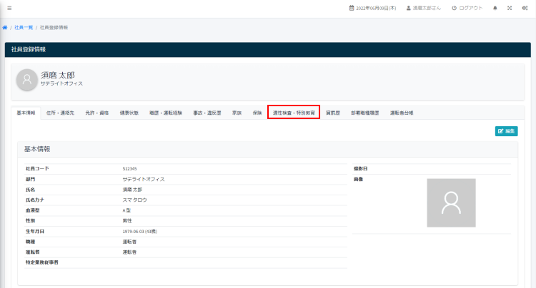 - 社員登録情報が表示されたら、適正検査・特別教育タブをクリックします。