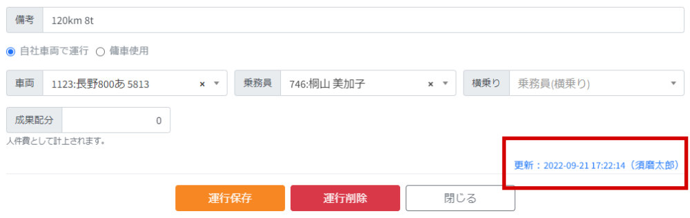車両情報や、社員情報、受注情報などを編集すると編集日時や編集したユーザーの履歴が登録されます。