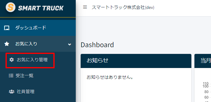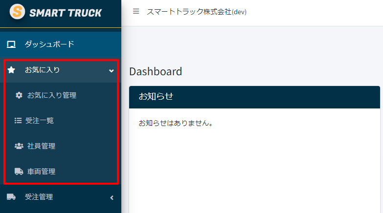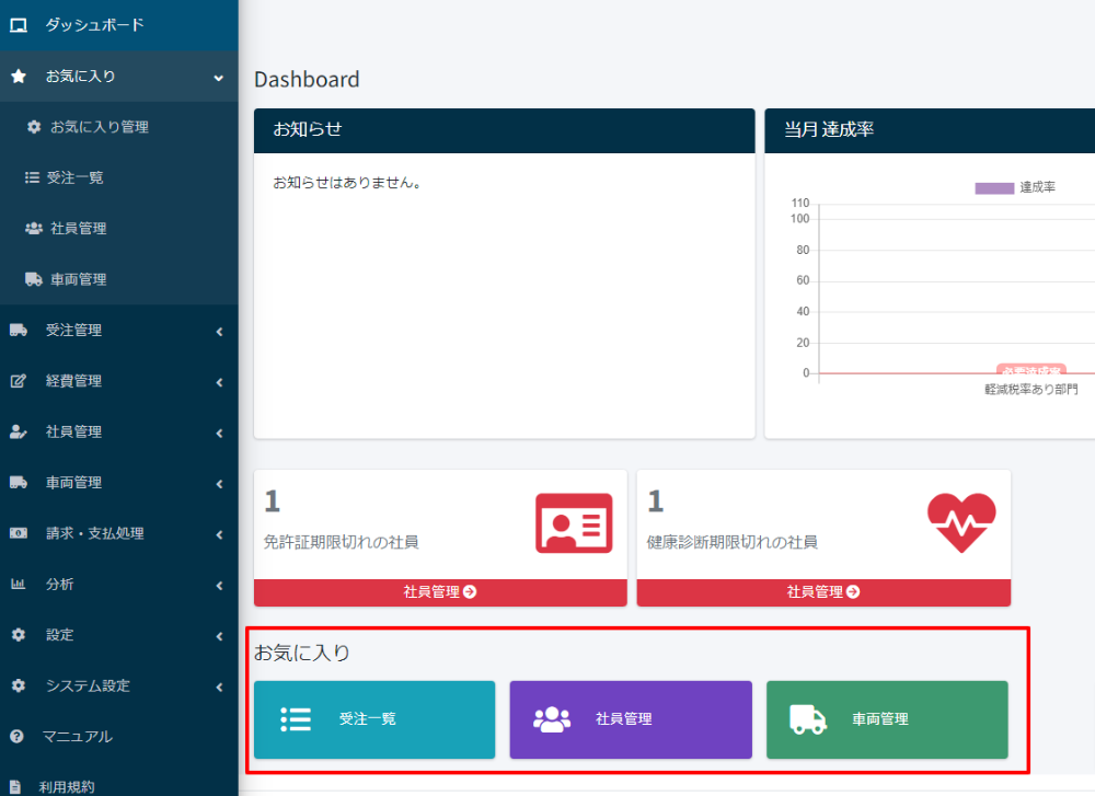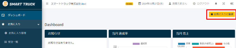 よく使うページなどをお気に入り登録することができます。お気に入り登録したページは、左メニューやダッシュボードに表示されます。