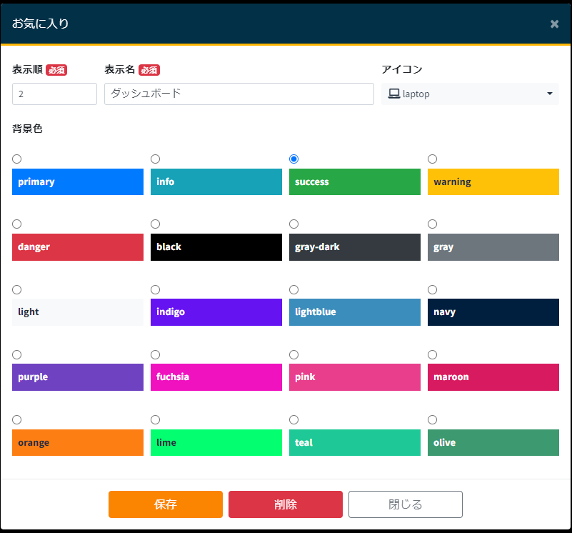 お気に入りは、表示名やアイコン、ダッシュボードに表示するバナーの背景色を編集することができます。
