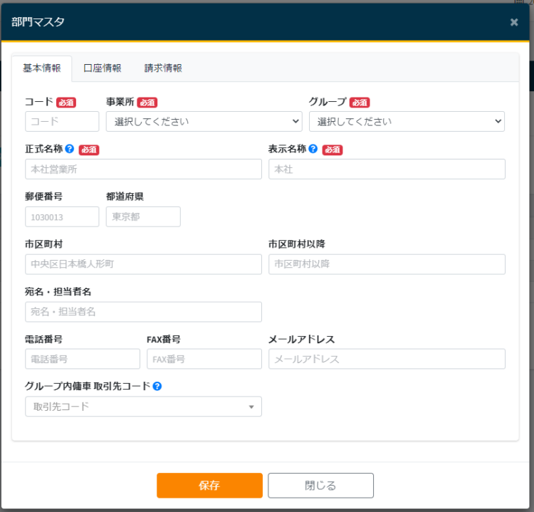 - 正式名称:必須項目です。部門の正式名称を入力します。