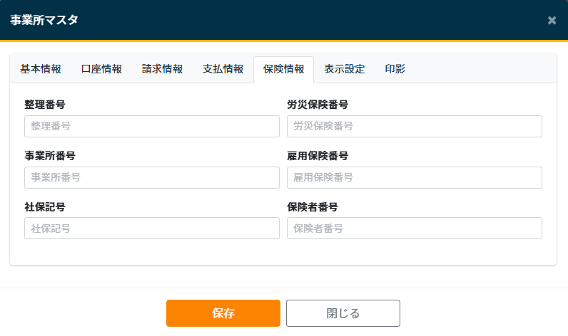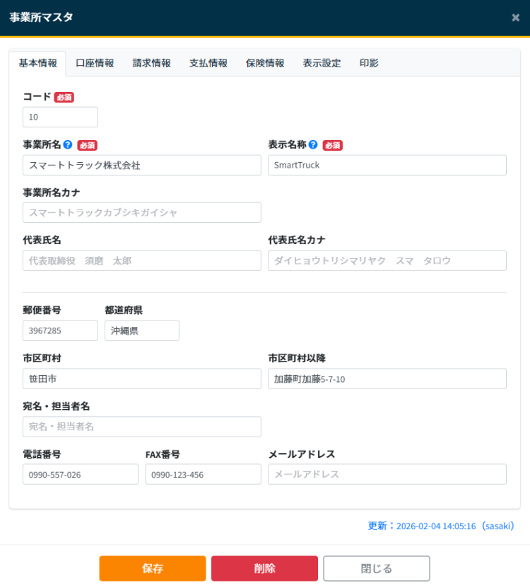 - 事業所名:必須項目です。事業所名称を入力します。請求書などで利用されます。