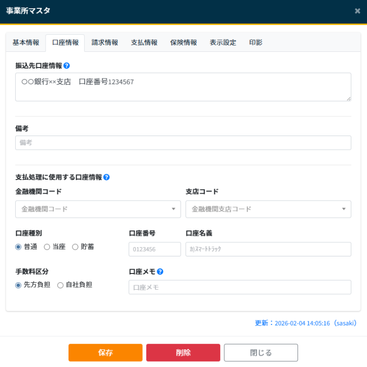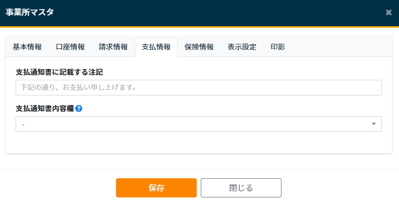 - 支払通知書内容欄:支払通知書の「内容欄」フォーマットを設定します(変更したい場合)。詳しくはスマートトラック管理者にお問い合わせください。