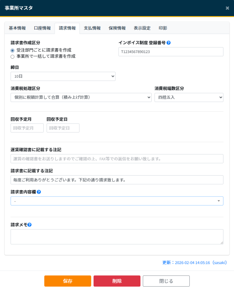 - 請求書請求区分:受注部門ごともしくは事業所で一括してに請求書を作成するのかを選択します。