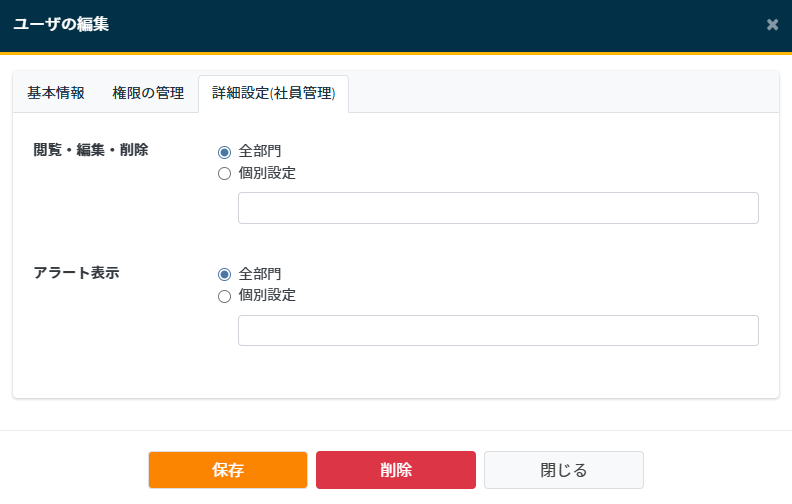 ユーザーごとに社員管理で表示、編集させる部門を絞りたい場合はこちらで個別設定してください。