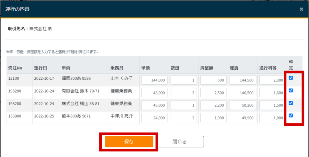 - 金額を確認し、必要なら修正を行い、2で確認した集計期間内の運行の確定チェックボックスにチェックをいれて保存ボタンを押します。